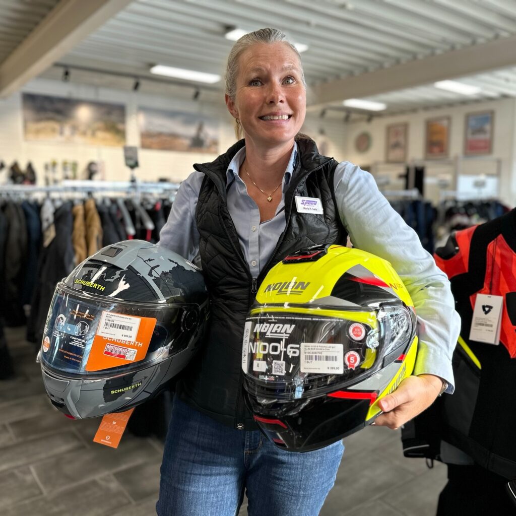 Butikkansvarlig Maria Heimvik Sæle viser årets nyheter innen kjøreutstyr. Få smakebiter på sikkerhetsutstyr og kjøreklær som gjør motorsykkelturen både tryggere og mer komfortabel.
