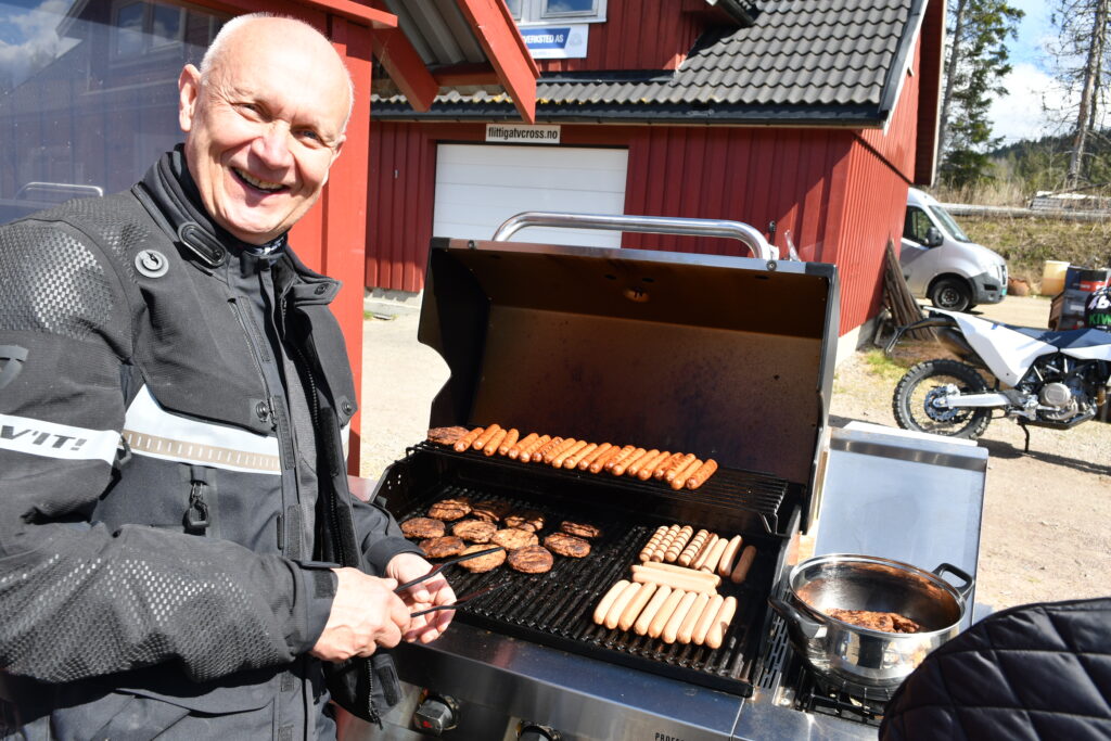 Etter to intensive timer var det tid for lunsj. Sultne adventureførere kastet seg over hamburgerne og pølsene Lise og Terje Bredal hadde klare på grillen.